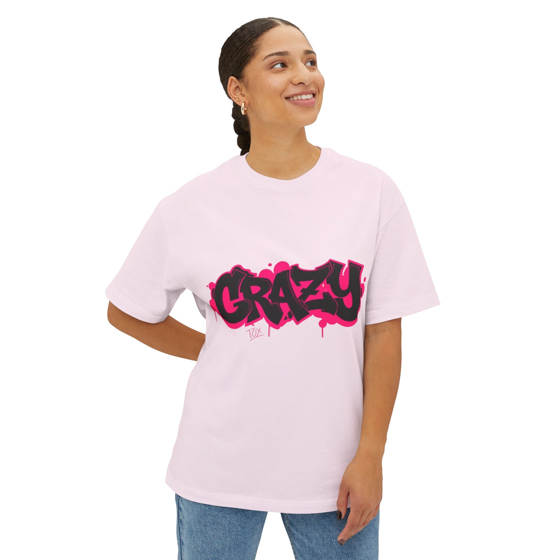 A bold, streetwise tee that reads like a shout from the block. The oversized boxy cut and dropped shoulders create a relaxed silhouette you can move in — roomy at the chest and sleeve for layering or wearing on its own. Across the chest, hand-style graffiti lettering reads “CRAZY” in saturated magenta with black shadowing and paint-splatter accents, giving the shirt an unapologetic, urban-art energy. Lightweight but substantial, the cotton feels soft against skin and the double-stitched hems hold up as you wear and wash it. Wear it to late-night skate sessions, open-mic nights, or city wanderings when you want your outfit to say you don’t follow the lines. The tear-away label keeps the neckline clean, and the tiny back logo adds a subtle maker’s mark without stealing the spotlight.