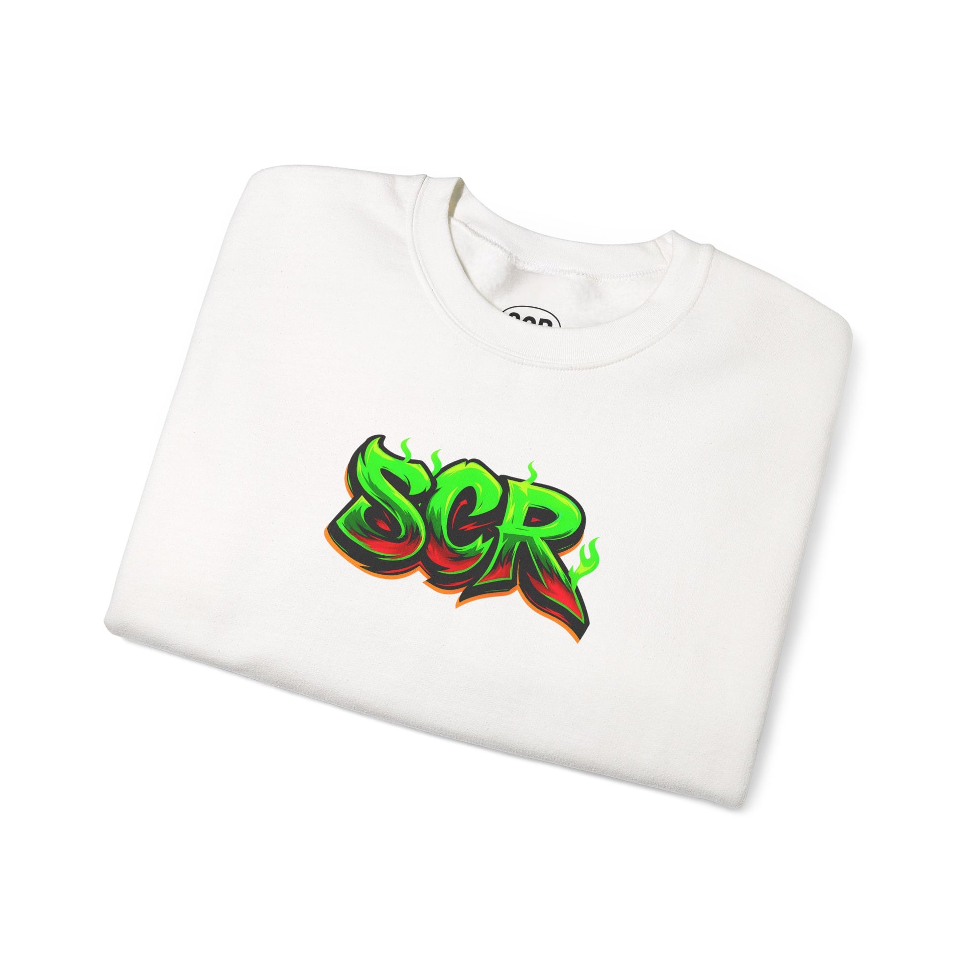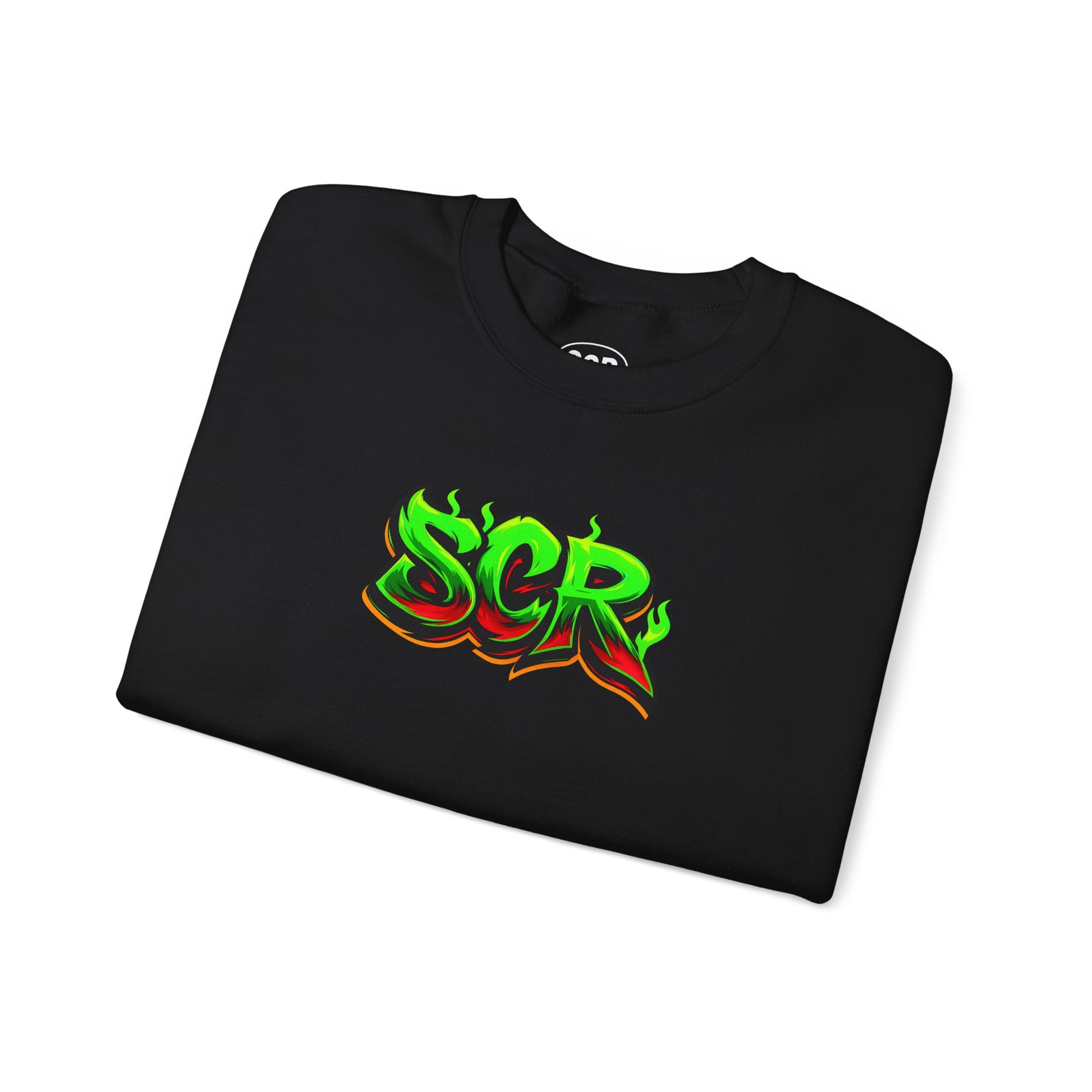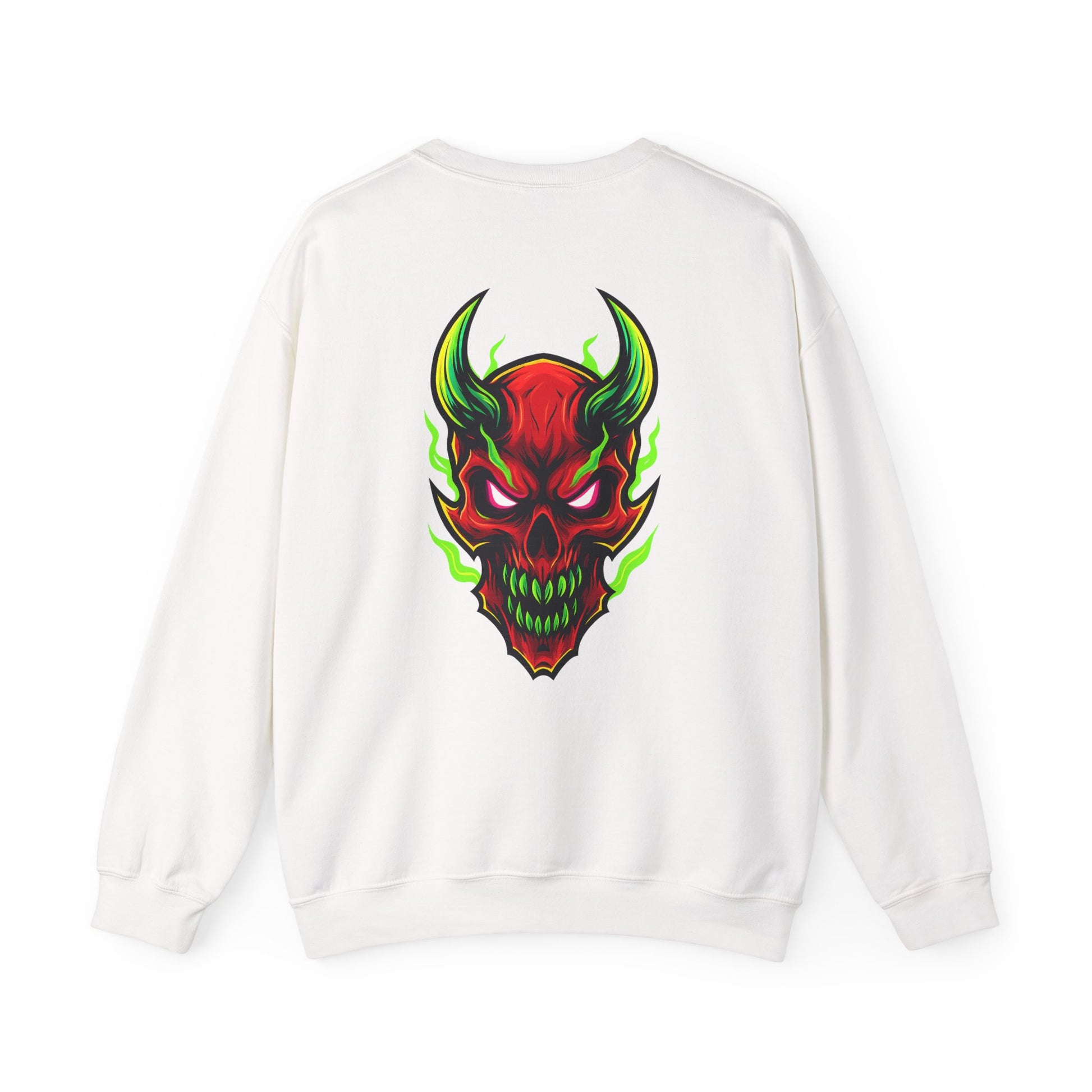 This crewneck sweatshirt brings bold street-art energy into everyday wear. The front carries a compact graffiti-style tag in vivid green and orange, while the back reveals a striking red horned skull outlined by neon green flames. It feels like a midnight skate session or a rundown alley mural translated into soft, durable fabric — loud, confident, and unapologetic. The medium-heavy cotton-poly blend keeps the print crisp and the garment cozy. Wear it layered over a tee for late-night hangs or solo when you want to make a statement without saying a word.
