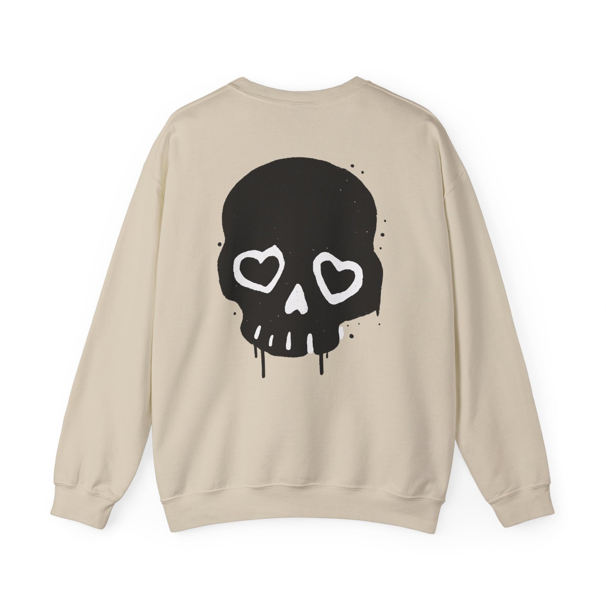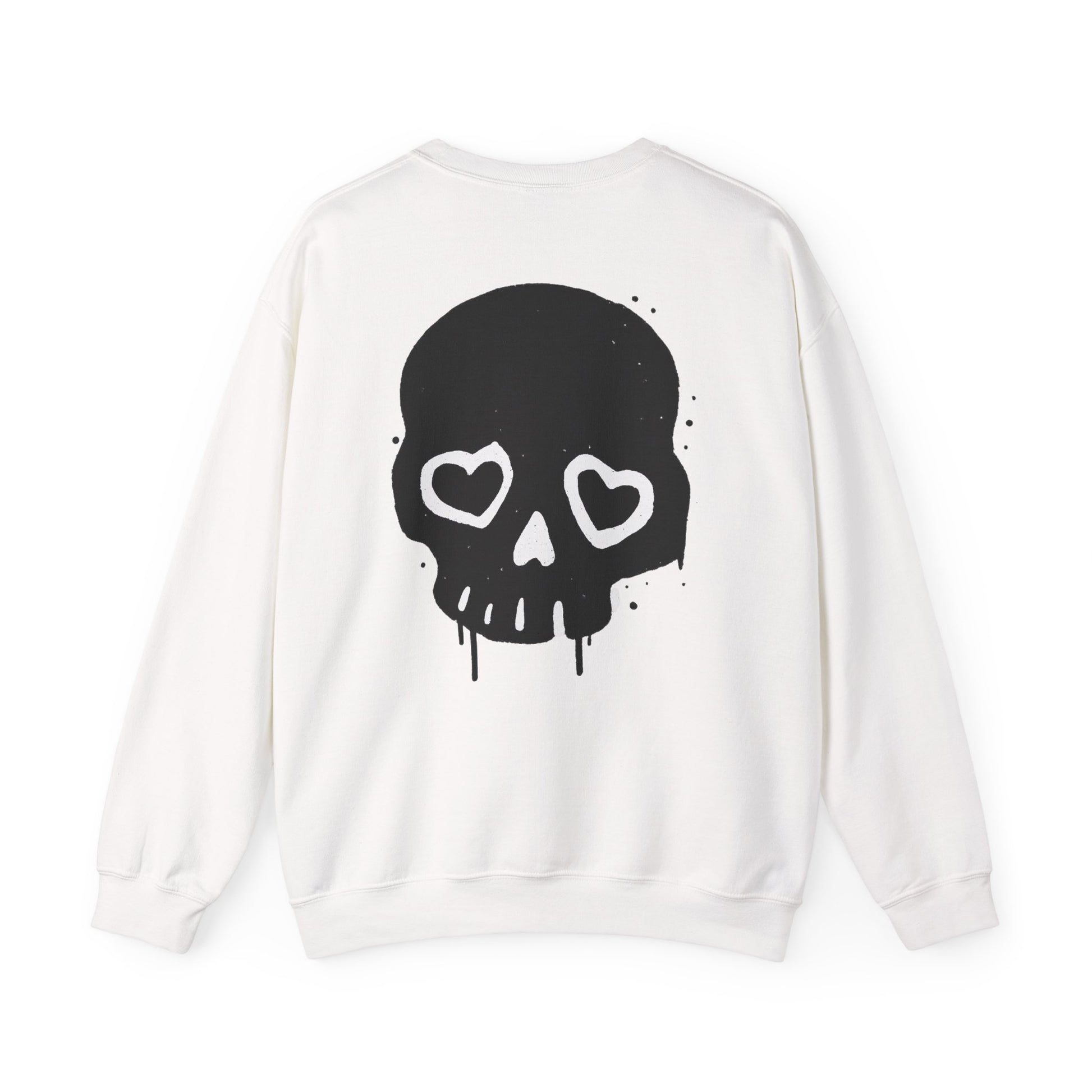 Soft, roomy, and a little bit rebellious — this crewneck settles into everyday life with a wink. The clean white sweatshirt carries bold, hand-drawn graphics: a dripping skull with heart-shaped eye sockets centered on the back and a punky “ØVERTHINKING” script across the chest. Wear it when you want warmth without heaviness, when you want your outfit to speak with dark humor, or when you’re meeting friends for late-night coffee and conversation. Durable double-needle stitching and a lived-in classic fit mean it moves with you, while ethically sourced cotton and OEKO-TEX dyes keep things thoughtful behind the scenes. Subtle embroidery and printed neck label details give it that finished, maker-crafted feel.